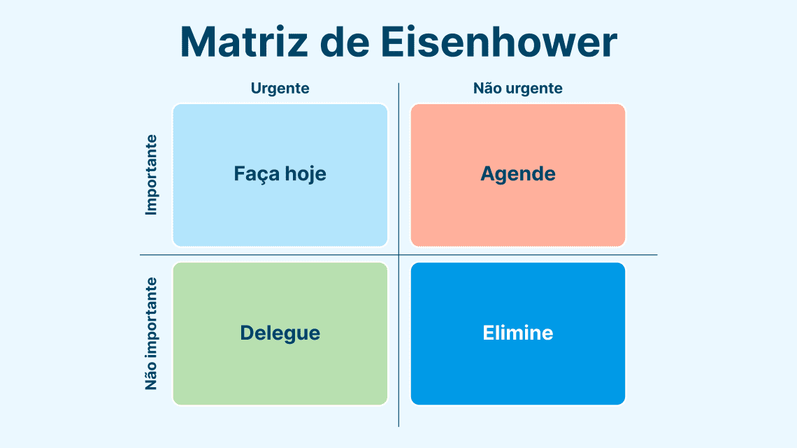 Esses quadrantes são importantes para a organização de quem utiliza este recurso, pois tornam as classificações das tarefas mais visíveis e perceptíveis. Para entender melhor, vamos explicar as nomenclaturas de cada um dos quadrantes da Matriz de Eisenhower: