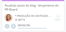 O RR-Board® oferece prazos realistas, uma vez que leva em consideração todas as tarefas de um responsável para calcular as datas de entrega. Em cada tarefa (card), ele mostra seu responsável, a data de entrega estimada e a barra de completude.