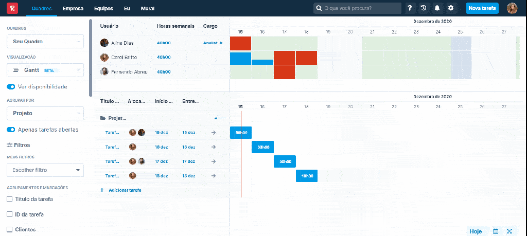 Por exemplo, ao mover uma tarefa no cronograma, o software ajusta automaticamente a disponibilidade do colaborador, garantindo que o prazo de entrega seja realinhado de acordo com a carga de trabalho dele. Isso permite uma distribuição mais equilibrada das tarefas.